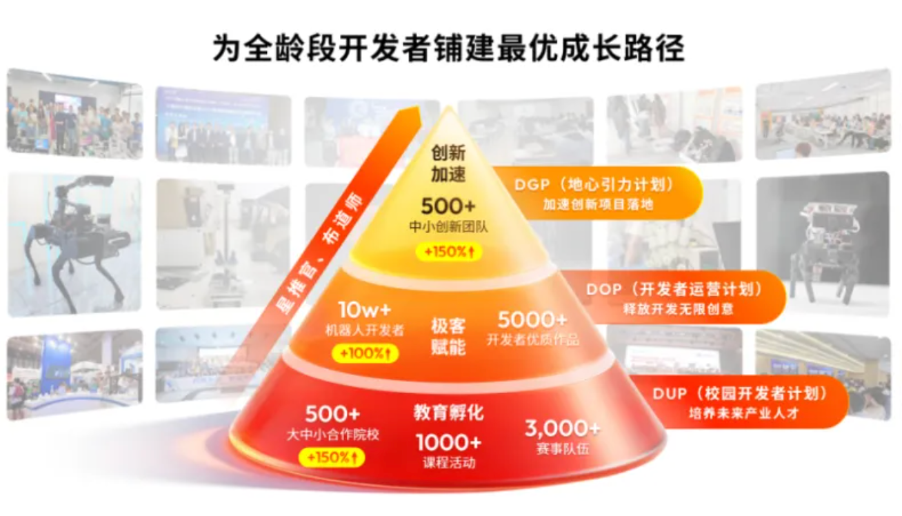与此同期,为了劝诱拓荒者,2022年地瓜机器东谈主的参谋东谈主员还会我方写课程去大学开课。王丛谈谈,这是因为他们梳理了拓荒者的金字塔画像,金字塔底部就是学生拓荒者,从基础握起,通过比赛撬动高校机器东谈主专科的学生和丰足,当今在生态层面仍是掩饰了500多所高校。