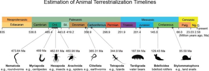 动物陆生演化时刻线的估算。时刻线日历为后验均值(代表最可能时刻的加权平均值)。图片着手:魏嘉琳