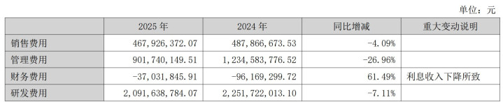 用度方面,中航光电2025年销售用度同比减少4.09%;照顾用度同比减少26.96%;财务用度同比增长61.49%;研发用度同比减少7.11%。