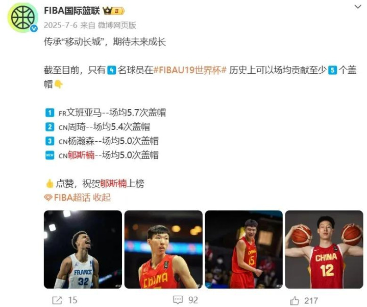 对了,郇斯楠于昨年U19寰宇杯场均孝敬11.3分4.6板5帽的惊艳判辨,也会相配有助于他挑战NBA,迄今为止FIBA史上只好四名球员能在U19寰宇杯场均5帽,其余三位分离是文班亚马(法国)、周琦和杨瀚森,这3位前辈无一例外一齐通过选秀干预了NBA。