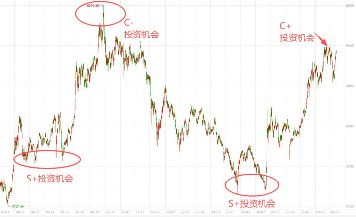 历史上几个紧迫时点,模子给出的投资契机是这样的:2020年疫情底是S+,2021年牛顶曾到C-,而2024年熊底亦然S+,2026年1月是C+。
