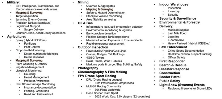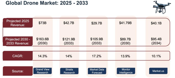 全球无东说念主机市集范围瞻望2025 年约 730 亿好意思元,2030 年将达 1636 亿好意思元,CAGR估算约14%。