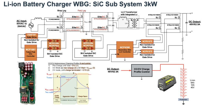当无东说念主机功率干与kW级别,充电恶果就成为运营资本的核心变量。安森好意思给出的决策是基于碳化硅(SiC)的3kW快充系统,架构包括图腾柱PFC、LLC谐振变换器和EliteSiC MOSFET,输入85V–264V AC,输出48V/62.5A DC,适配10S电板。