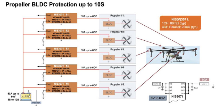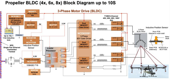 无东说念主机简直一皆遴荐无刷直流电机(BLDC),架构包括eFuse保护层、三相栅极启动器、MOSFET功率器件和位置传感器。