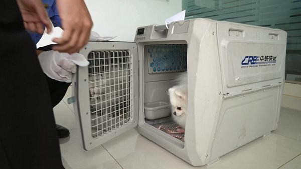 中铁快运南宁东站交易使命主谈主员正在办理宠物托运业务手续。程睿哲摄