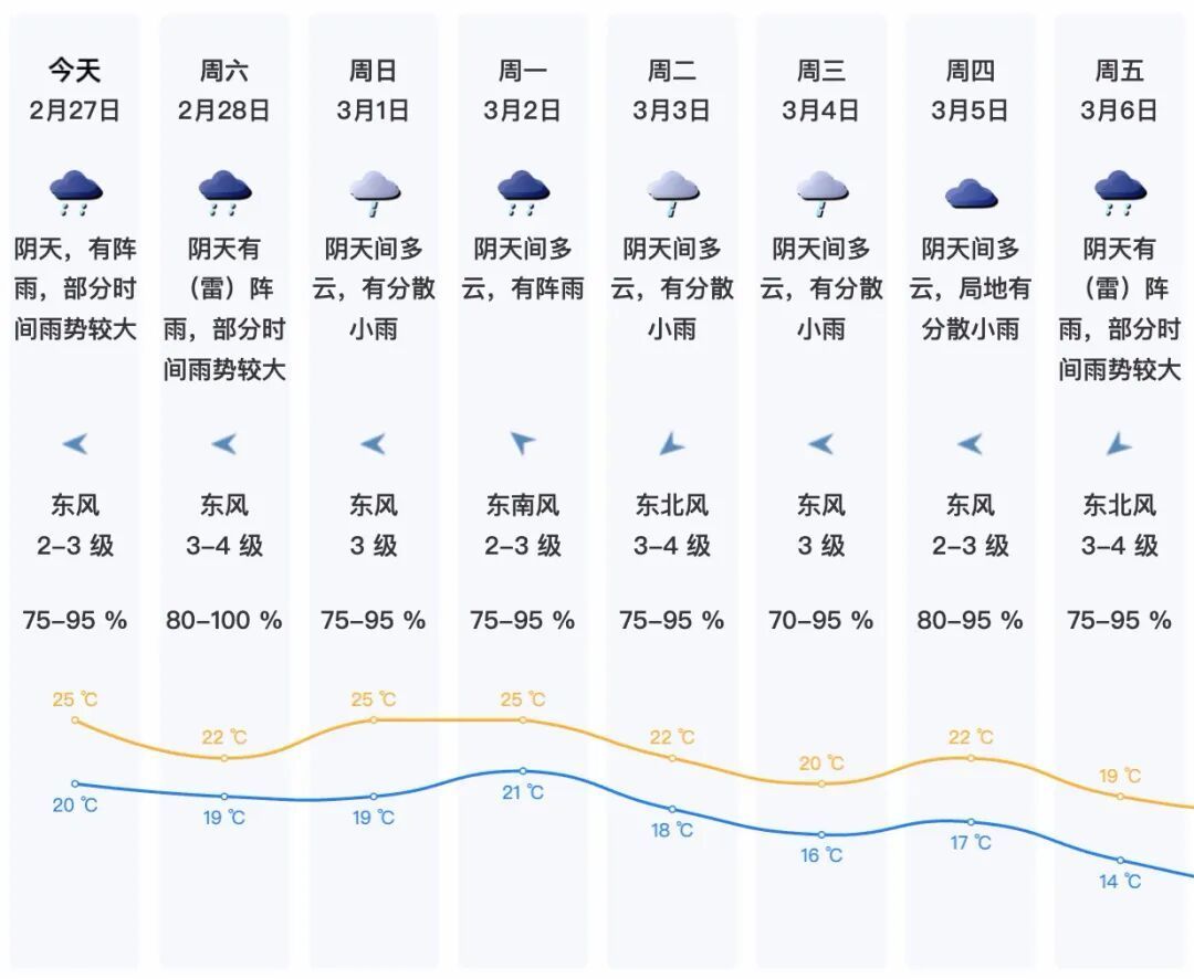 【深圳天气】“广东天气”揣摸,2月底至3月初,广东的降雨渐趋无为,其中,2月26日至2月28日,广东自北向南有一次中到大雨局部暴雨的降水经过,部分市县伴有雷电、短时强降水和6~8级的短时大风。深圳具体天气如下: