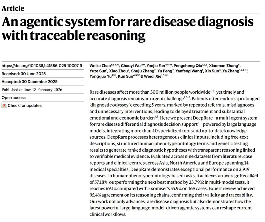 新春佳节之际,中国东谈主工智能与医学交叉领域迎来重磅突破。北京时刻2月19日凌晨,外洋顶级学术期刊《当然》在线刊发上海交通大学医学院从属新华病院孙锟陶冶、余永国陶冶领衔团队与上海交通大学东谈主工智能学院张娅陶冶、谢伟迪副陶冶领衔团队汇聚估计效果——DeepRare。