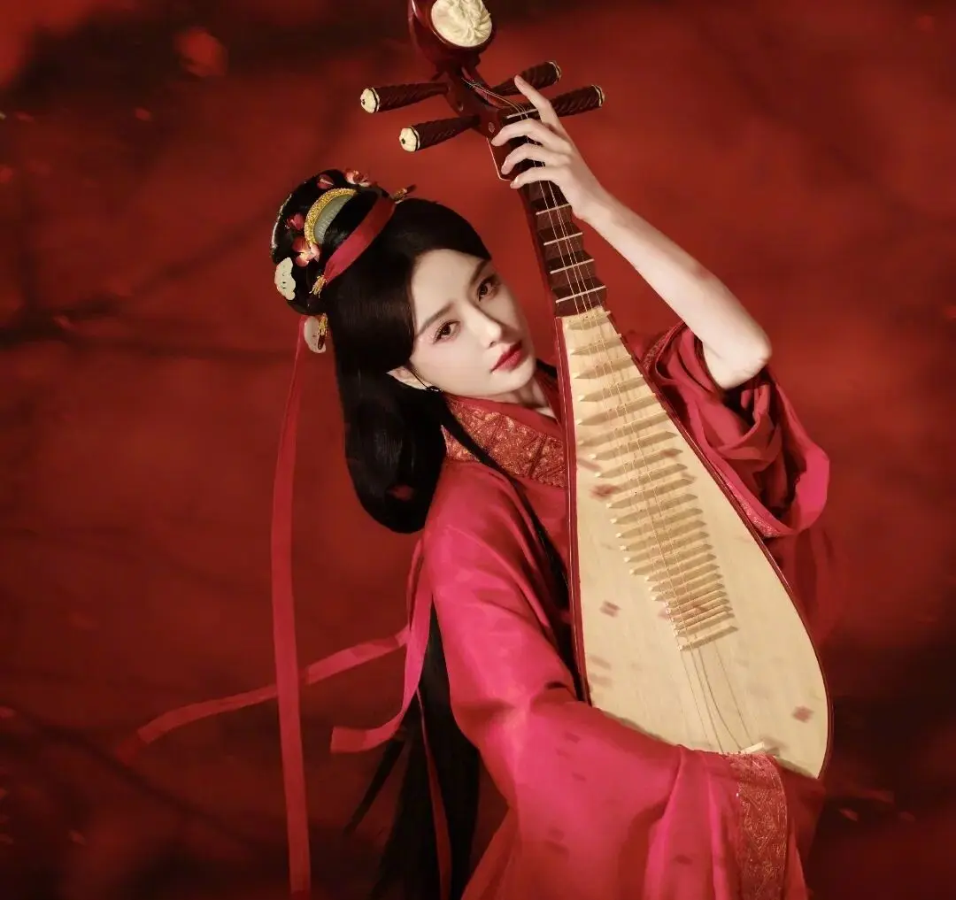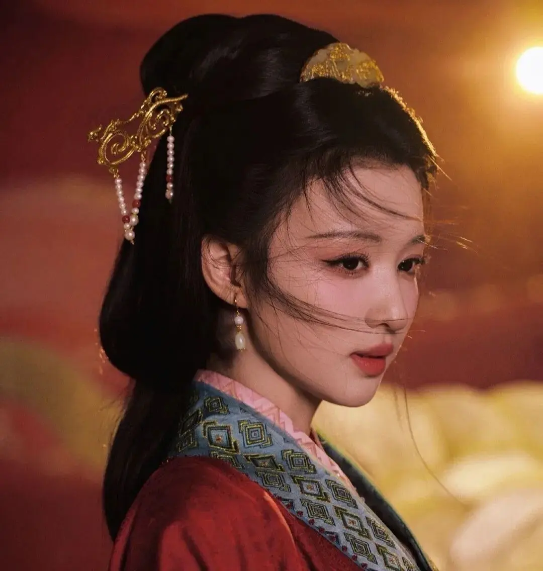 身披赤红战国袍,肩缀金色桃花,眼尾点缀花瓣妆容,低髻造型温婉大气。时隔八年再穿古装,其“灼灼其华”的明媚感被央媒评为“冻龄神颜”。